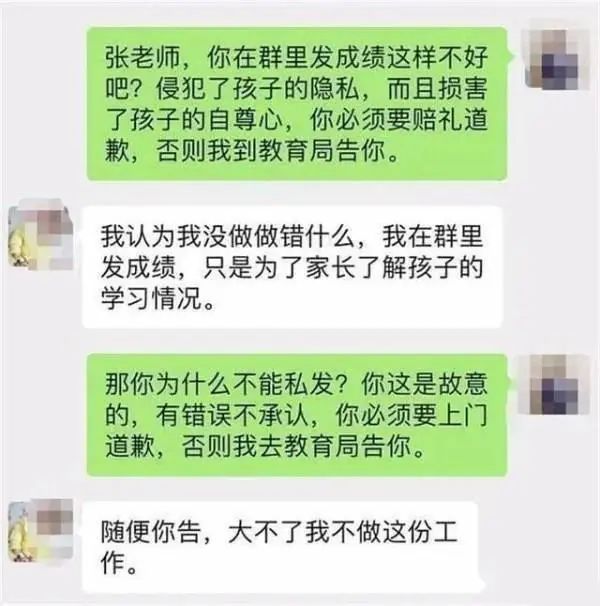 之前,就有一名老师因在家长群里公布了学生成绩,引发一名家长的不满,要求老师“必须要赔礼道歉”,否则“我到教育局告你!”